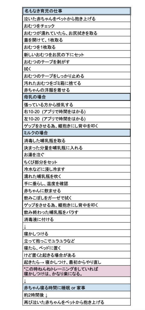 ちなみに、新生児育児のママの「名もなき育児の仕事」の無限ループを表にまとめてみました。この表にない「名もなき育児の仕事」は、他にも数えきれないほどあります。