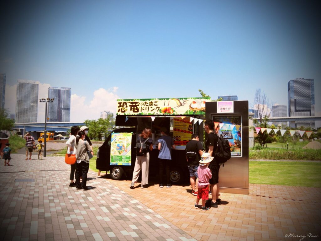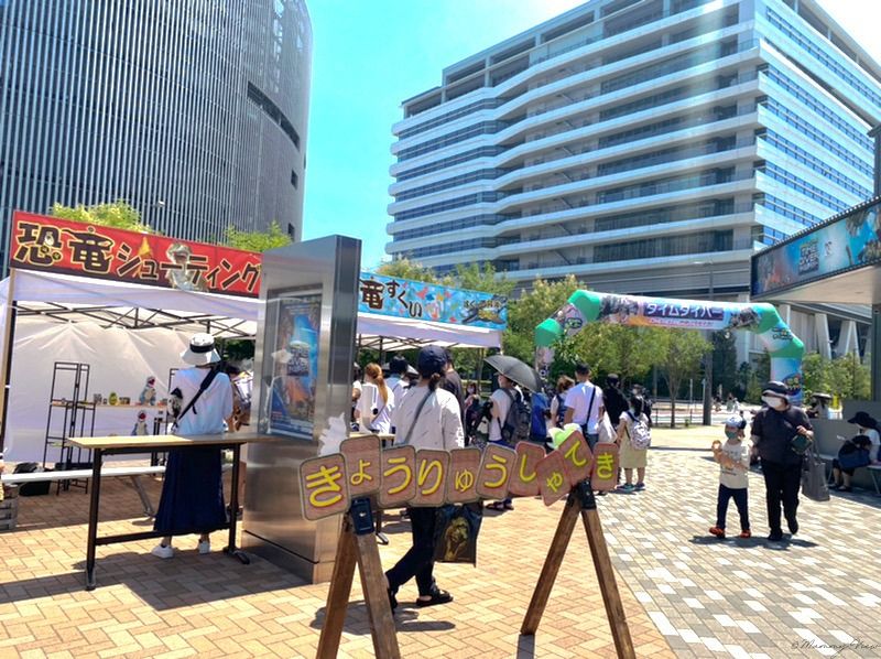 2022年7月23日(土) 〜9月25日(日)まで開催しています。恐竜縁日エリアは「恐竜シューティング(射的)」「恐竜すくい」「恐竜化石発掘場(アンモナイト探し)」、ワークショップエリアは「オリジナル恐竜ティシャツ作り」「恐竜キャンドル」などに参加できます。恐竜の夏祭りと言ってもいいでしょう。本当にたくさんのアクティビティーありました。また、タイムダイバーを観に行かなくても、アクティビティーはどなたでも参加できます。