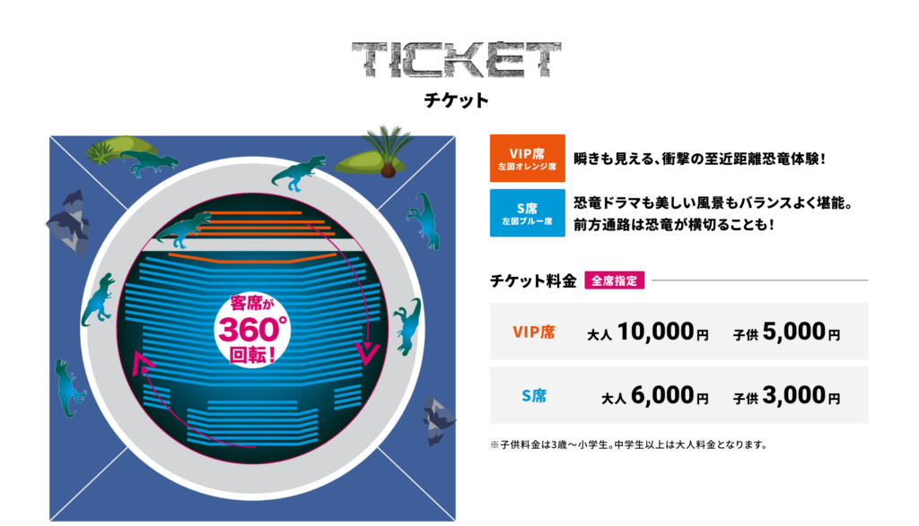 前回の2021年の公演は、座席料金が4段階に分けられ、VIP席に子ども料金がありませんでした。S席でも大人・子ども合わせ合計金額 17,660円とまぁまぁいいお値段でしたが、今回はチケットがお得なスペシャルプライスになりました。VIP席に子ども料金が適応され、VIP席以降の座席は全てS席となりました。詳細は下記のとおりです。