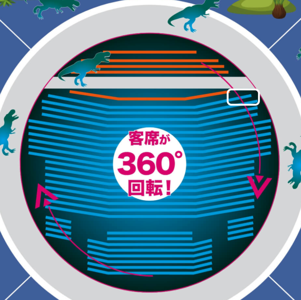 前回の経験を活かし、S席で一番恐竜が近く来る席を選びました。座席はブロックA7列目48番です。見辛い事はほとんどなく、この通路には恐竜が何度も通り、真横の通路からも恐竜達が登場するので、とてもおすすめの席です。(下記、座席から撮影した動画もアップしています)